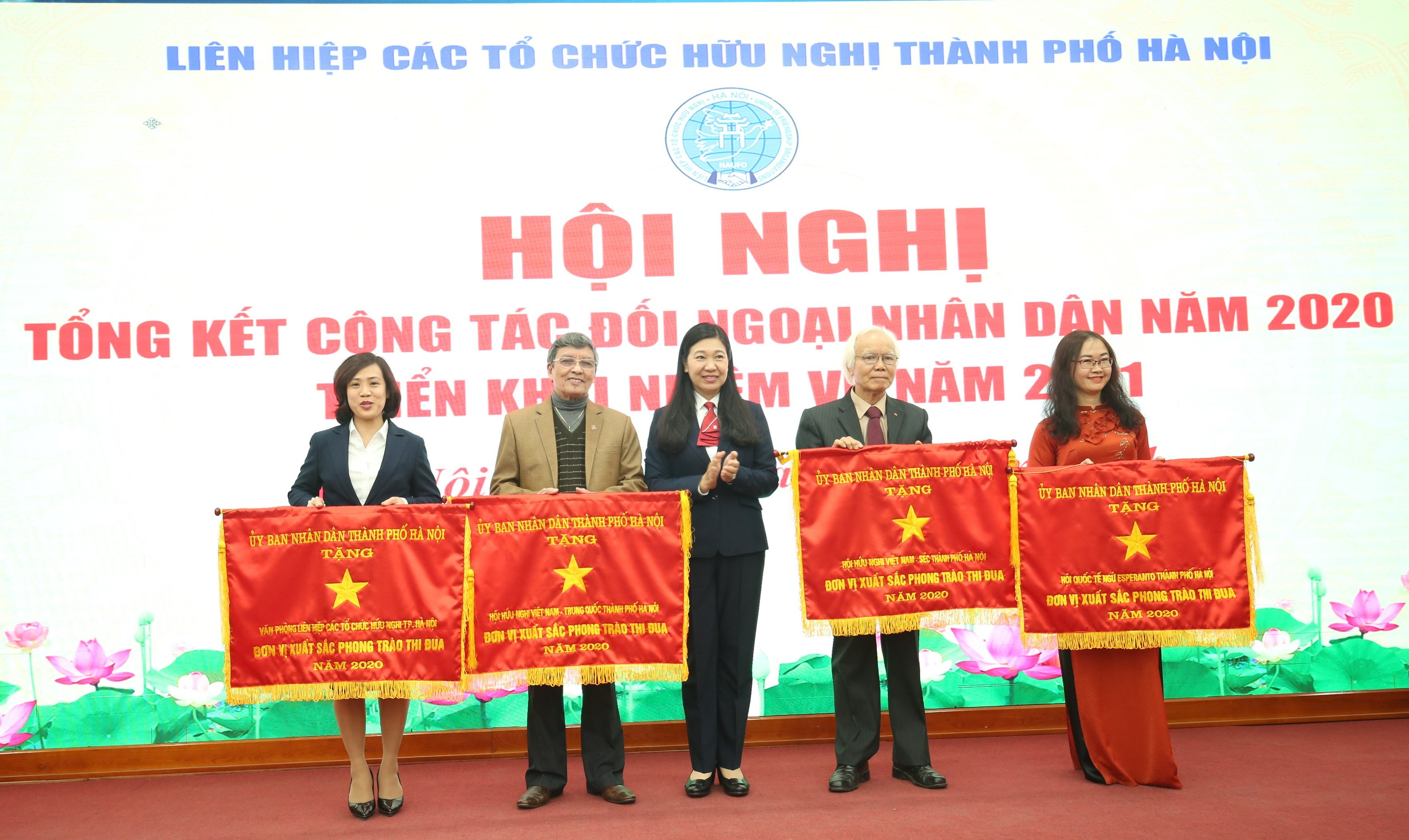| Chủ tịch Liên hiệp các tổ chức hữu nghị thành phố Hà Nội Nguyễn Lan Hương trao cờ tặng các tập thể có thành tích xuất sắc trong năm 2020 (Ảnh: MT) |