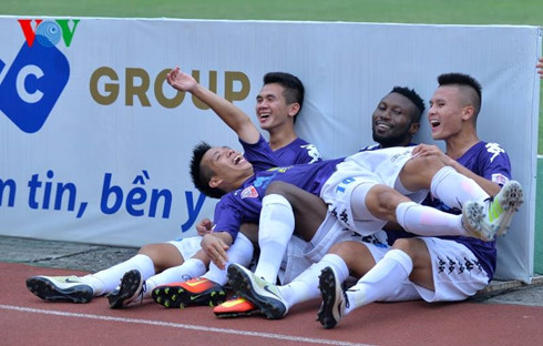 Các cầu thủ Hà Nội T&T ăn mừng bàn thắng