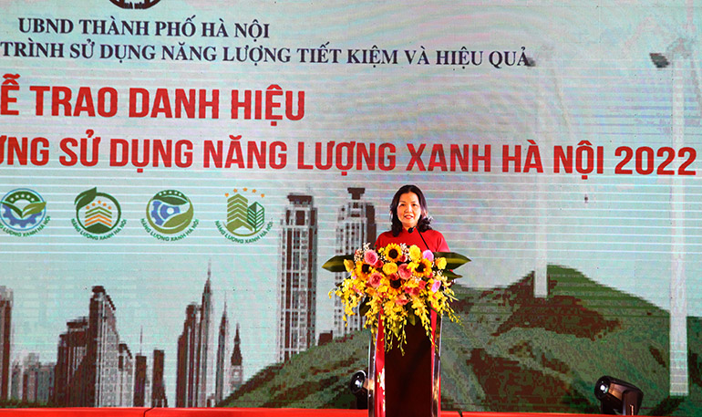 Tới dự và phát biểu tại lễ trao giải, bà Trần Thị Phương Lan, Quyền Giám đốc Sở Công Thương Hà Nội cho biết, lễ công bố, trao danh hiệu cơ sở, công trình xây dựng sử dụng năng lượng xanh năm 2022 nhằm tôn vinh các cơ sở, doanh nghiệp sử dụng năng lượng xanh. Đồng thời, phổ biến, nhân rộng các giải pháp tiết kiệm năng lượng tiêu biểu. Việc tôn vinh các cơ sở, doanh nghiệp sử dụng năng lượng xanh cũng như phổ biến, nhân rộng các giải pháp tiết kiệm năng lượng tiêu biểu là giải pháp quan trọng để các cơ sở có mô hình tương tự áp dụng, thúc đẩy công tác quản lý, sử dụng năng lượng hiệu quả, nâng cao hiệu suất sử dụng năng lượng của Thành phố; thể hiện quyết tâm của Thành phố “Cùng kiến tạo, cùng hành động, cùng phát triển” với các doanh nghiệp trong quá trình hội nhập quốc tế.