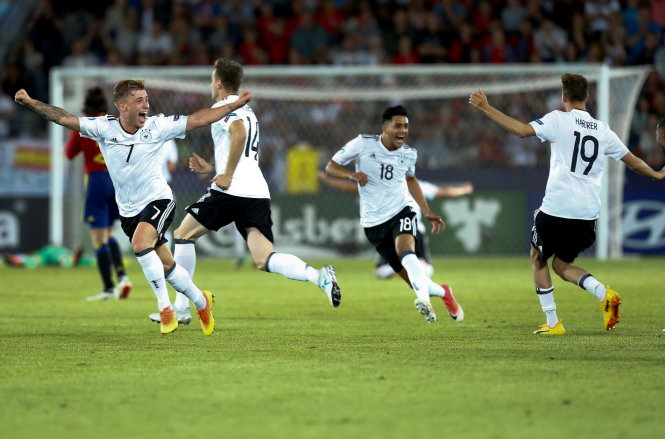 Niềm vui của các cầu thủ U-21 Đức sau khi ghi bàn vào lưới Tây Ban Nha. Ảnh: Reuters