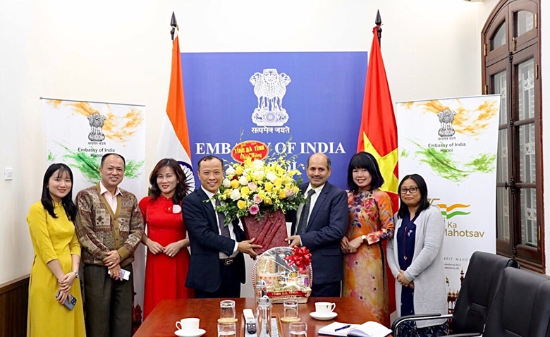 | Đoàn công tác Sở Ngoại vụ Hà Tĩnh chúc mừng Đại sứ quán Ấn Độ nhân dịp Năm mới. (Ảnh: Sở Ngoại vụ Hà Tĩnh) |