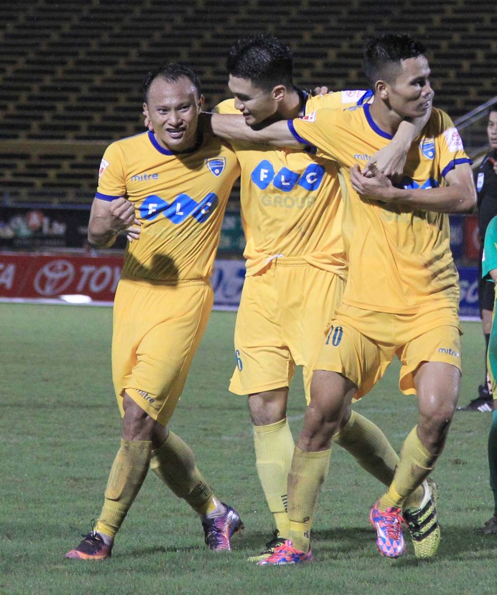 Đồng đội mừng bàn thắng của Văn Thắng (phải) ấn định chiến thắng 4-1 cho Thanh Hóa.