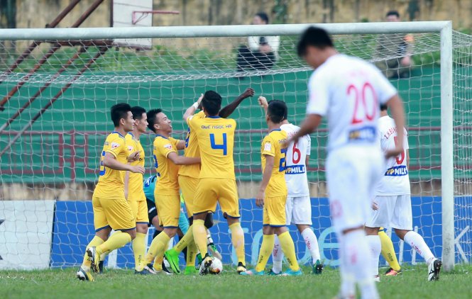 Các cầu thủ SLNA ăn mừng bàn thắng vào lưới HAGL. Ảnh: Nam Khánh