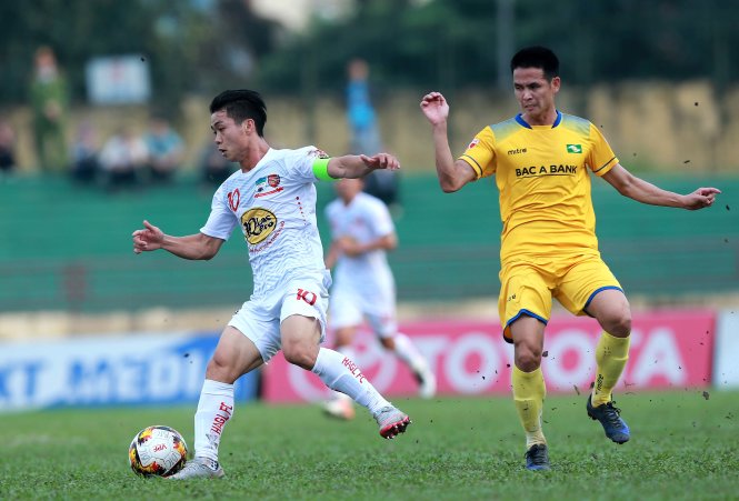 Công Phượng (trái) thi đấu khá nhạt nhòa trước SLNA. Ảnh: Nam Khánh