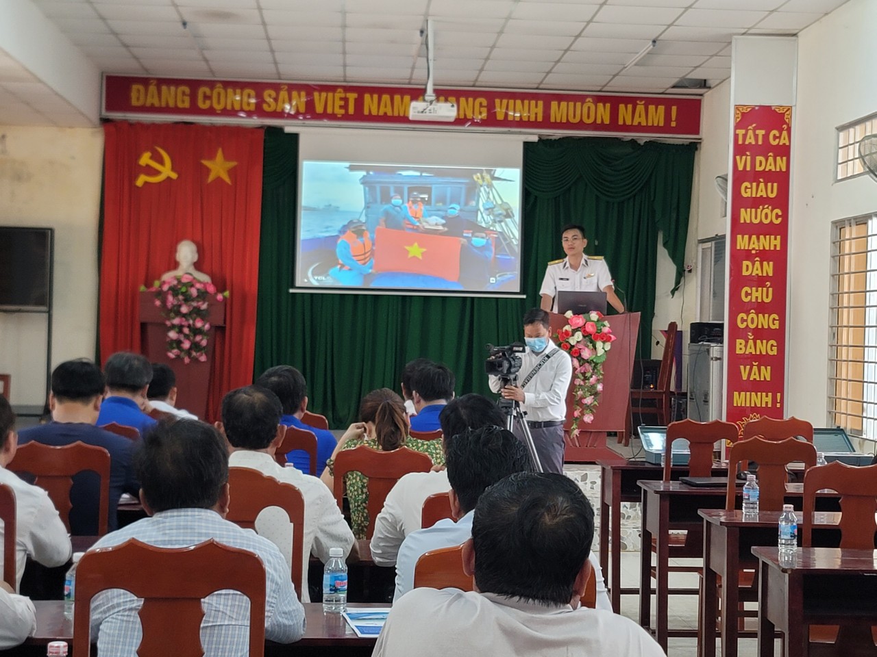 | Báo cáo viên của Hải đoàn 129 Hải quân đã tuyên truyền cho hơn 100 chủ tàu, thuyền trưởng và ngư dân tại Thị trấn Tiệm Tôm, huyện Ba Tri, tỉnh Bến Tre. |