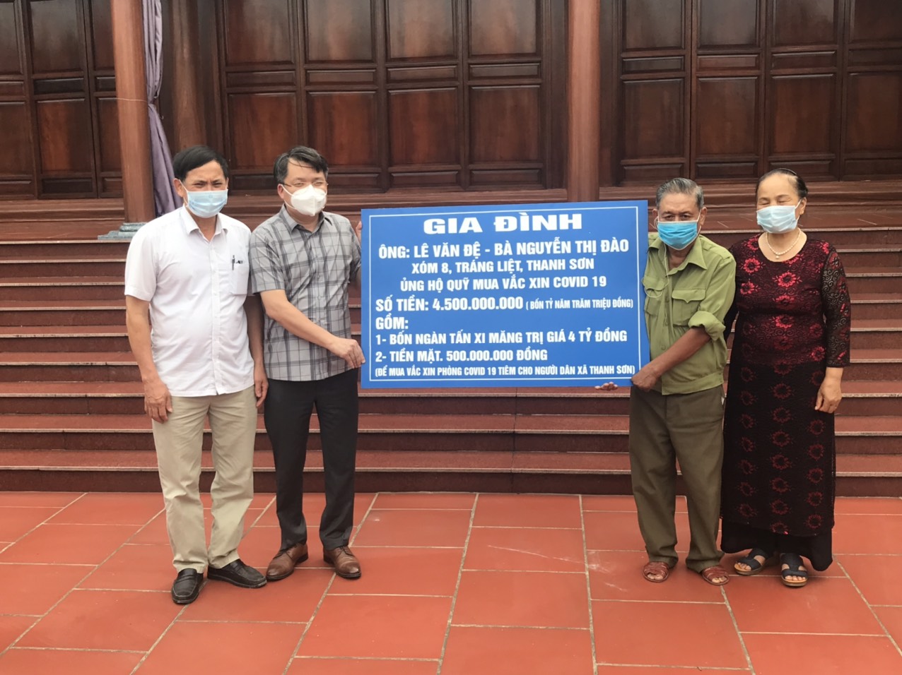 Theo đó, gia đình ông Lê Văn Đệ đã trao tặng 500 triệu đồng tiền mặt và 4.000 tấn xi măng Hữu Nghị (trị giá 4 tỉ đồng) để địa phương bán lấy kinh phí hỗ trợ Quỹ mua vắc xin COVID-19 của xã Thanh Sơn.