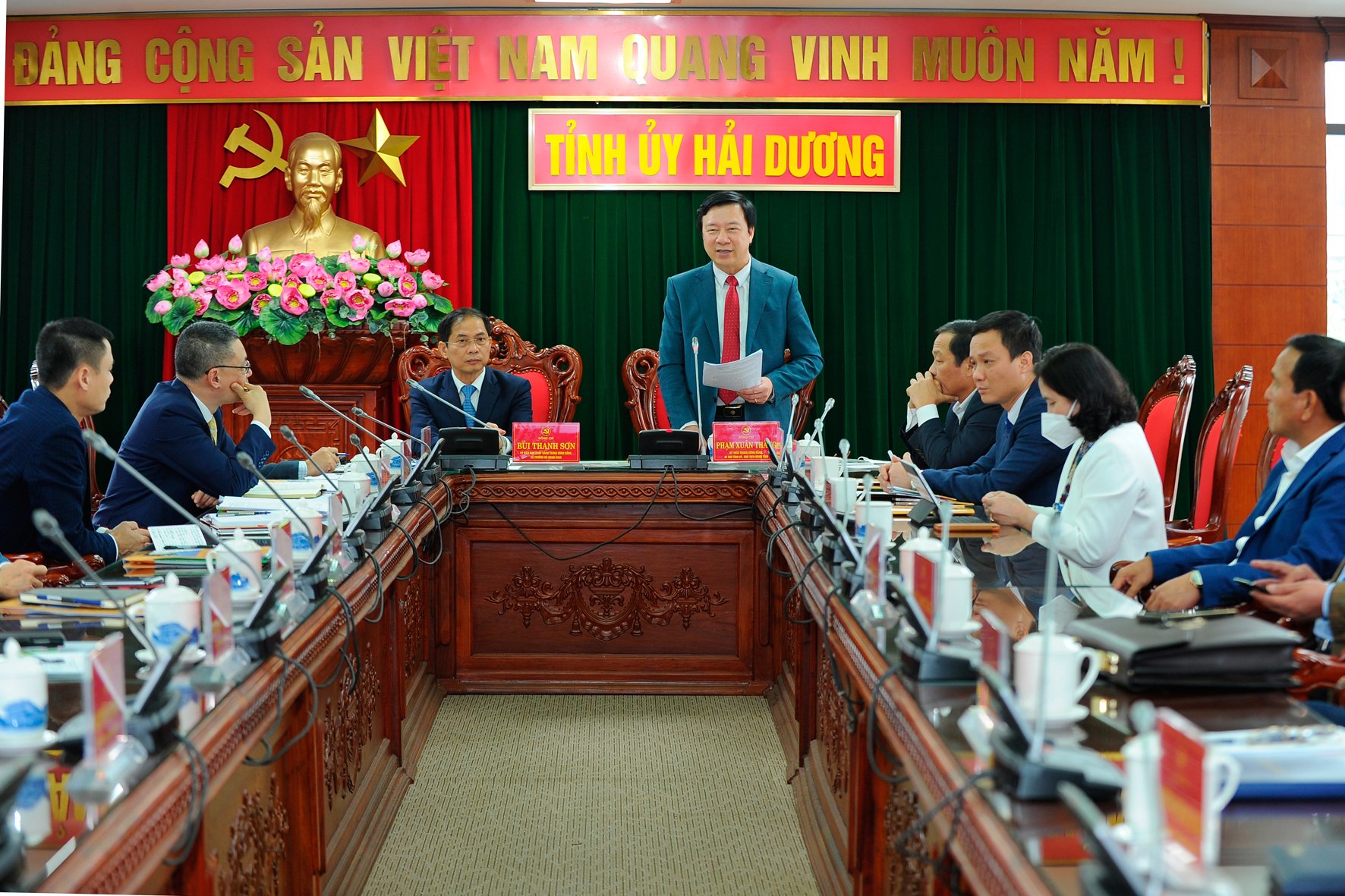 Phát biểu tại buổi làm việc, Bộ trưởng Ngoại giao Bùi Thanh Sơn chúc mừng những thành tựu Hải Dương đạt được những năm qua, nhất là thực hiện thành công mục tiêu kép vừa phòng chống dịch COVID-19, vừa phát triển kinh tế-xã hội, đạt mức tăng trưởng cao trong năm 2021.