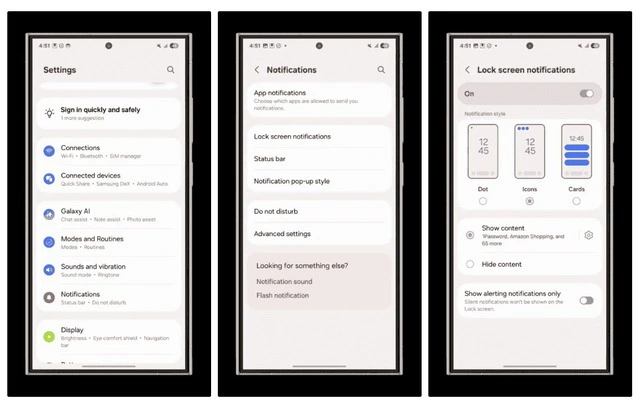 Một 'cú lừa' khác của One UI 7 là mặc định chỉ hiển thị các biểu tượng nhỏ cho thông báo trên màn hình khóa. Bạn phải chạm vào từng biểu tượng để xem nội dung, khá bất tiện nếu muốn liếc nhanh thông tin. Để khôi phục lại thông báo dạng thẻ chi tiết, hãy làm theo các bước sau: