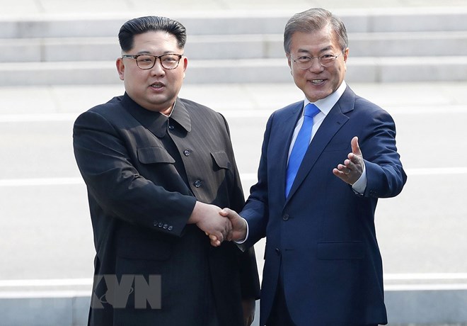 Trong cuộc gặp thượng đỉnh liên Triều ngày 27/4 vừa qua, lãnh đạo hai miền Triều Tiên đã ký Tuyên bố chung Panmunjom, trong đó cam kết sẽ ra tuyên bố kết thúc chiến tranh trong năm nay. Tuyên bố chung cũng nêu rõ Hàn Quốc và Triều Tiên xác nhận mục tiêu chung trong việc giải trừ hạt nhân trên Bán đảo Triều Tiên; tích cực thúc đẩy các cuộc đàm phán 3 bên, bao gồm hai miền Triều Tiên và Mỹ, hoặc cơ chế đàm phán 4 bên, bao gồm cả Trung Quốc, để tiến tới ký hiệp định hòa bình, chấm dứt chiến tranh trên bán đảo Triều Tiên và xây dựng nền hòa bình vững chắc, lâu dài. Hai bên cũng nhất trí xúc tiến tổ chức chuyến thăm của Tổng thống Moon Jae-in đến Bình Nhưỡng vào cuối năm nay./.