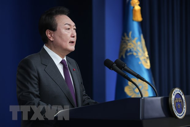 Tổng thống Hàn Quốc Yoon Suk-yeol trong bài phát biểu chúc mừng Năm mới, tại Seoul ngày 1/1/2023. (Ảnh: Yonhap/TTXVN)