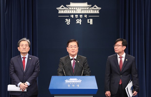Ông Chung Eui-yong, Cố vấn An ninh Quốc gia Hàn Quốc (ở giữa) phát biểu tại buổi họp báo, ngày 10/11. (Nguồn: Yonhap)