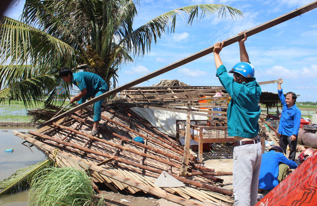 Lực lượng dân quân huyện Cần Đước hỗ trợ người dân sửa chữa, khắc phục hậu quả thiên tai. Ảnh: Cẩm Tú