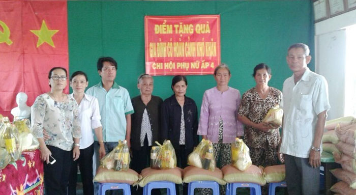 Chị Nguyễn Thị Cẩm Tú vận động các mạnh thường quân tặng quà cho nạn nhân chất độc da cam ở ấp 4, xã An Thạnh