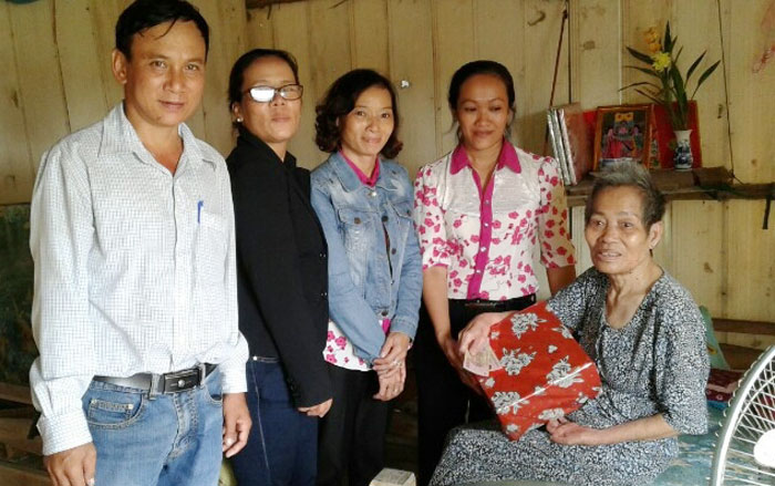 Chị Nguyễn Thị Cẩm Tú (bìa trái) tặng quà những hộ khó khăn