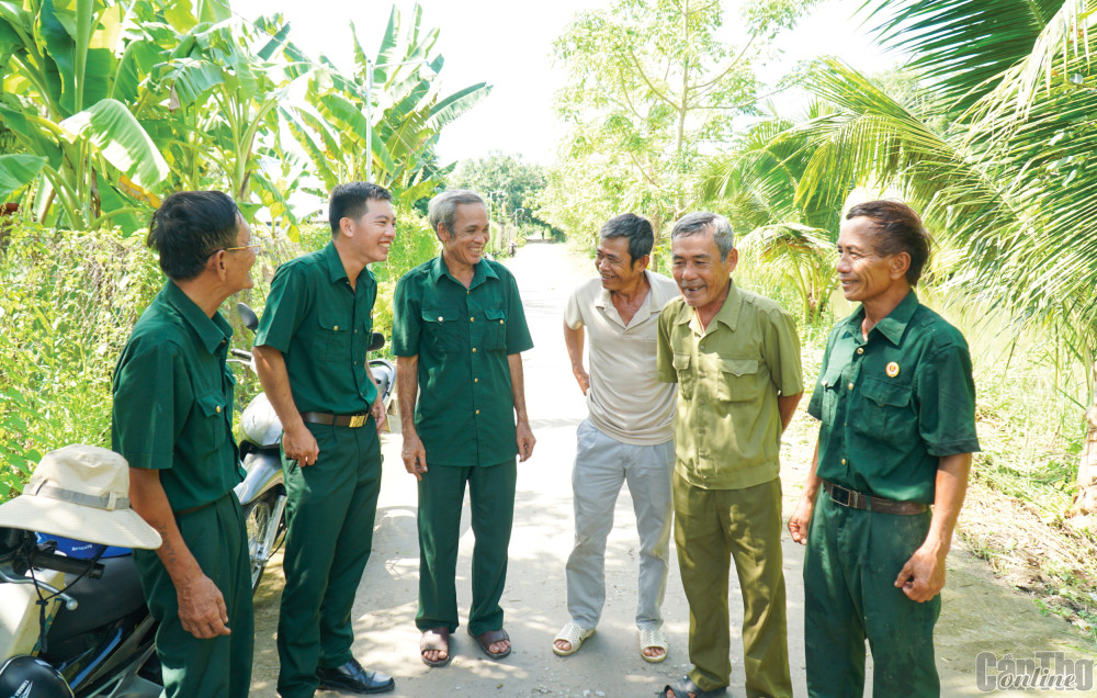 Anh Lê Đức Trọng (thứ hai, từ trái sang), Chủ tịch Hội CCB xã Thới Hưng, huyện Cờ Đỏ, trao đổi các CCB ở ấp 4 về mô hình “Tuyến đường sáng - xanh - sạch - đẹp” vừa thực hiện ở ấp.