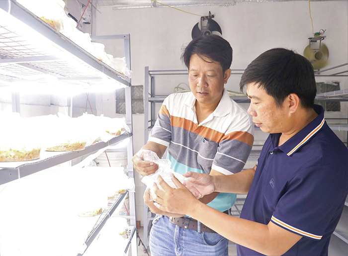 Anh Hoàng Quốc Bảo (bìa trái) giới thiệu quy trình nuôi trồng đông trùng hạ thảo đến đại diện Hợp tác xã Dịch vụ nông nghiệp thanh niên đô thị (Trung tâm Dịch vụ việc làm thanh niên Cần Thơ).
