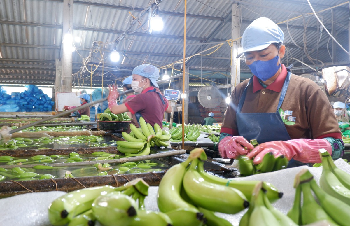 Sau khi tham quan vườn chuối, ông Huy dẫn chúng tôi đến nhà máy sơ chế để tìm hiểu về quy trình vận chuyển, vệ sinh, đóng gói để đưa sản phẩm đến tay người tiêu dùng. Nơi đây có hàng chục công nhân đang làm việc, không khí lao động tất bật.