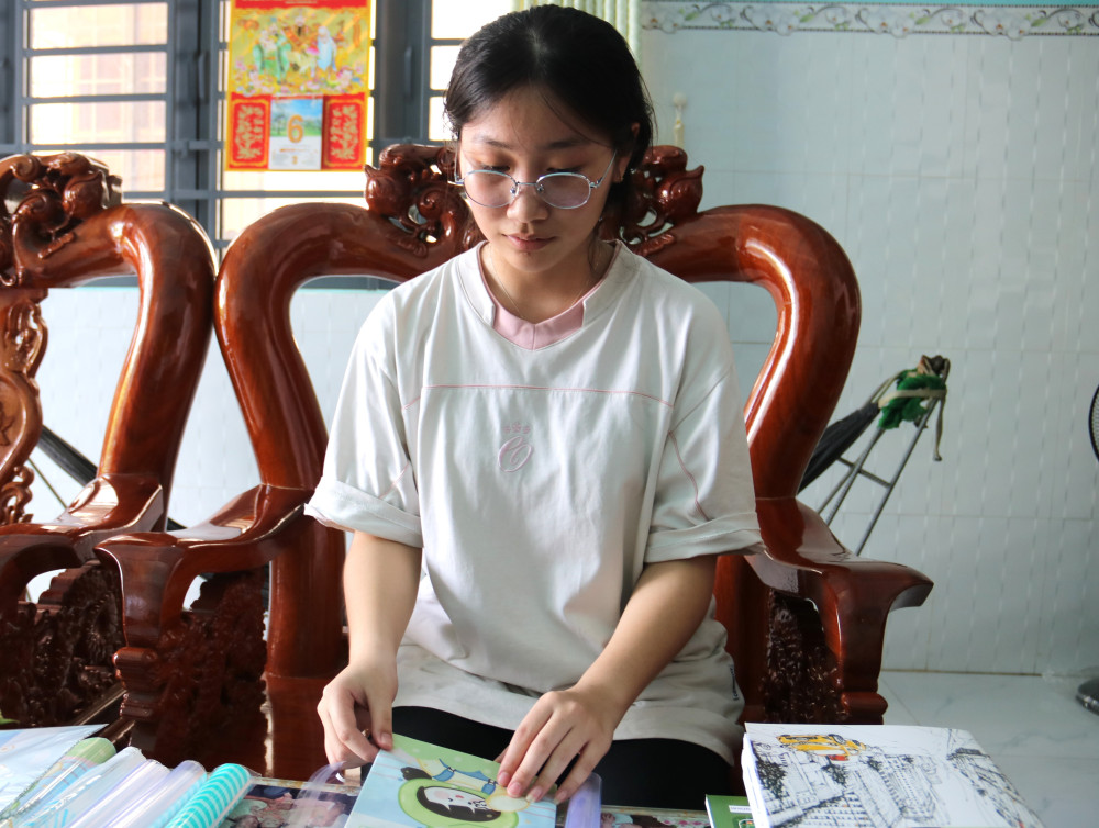 Em Phạm Huỳnh Khánh Như (phường 3, TP.Tân An) bao bìa tập sách, chuẩn bị cho năm học mới