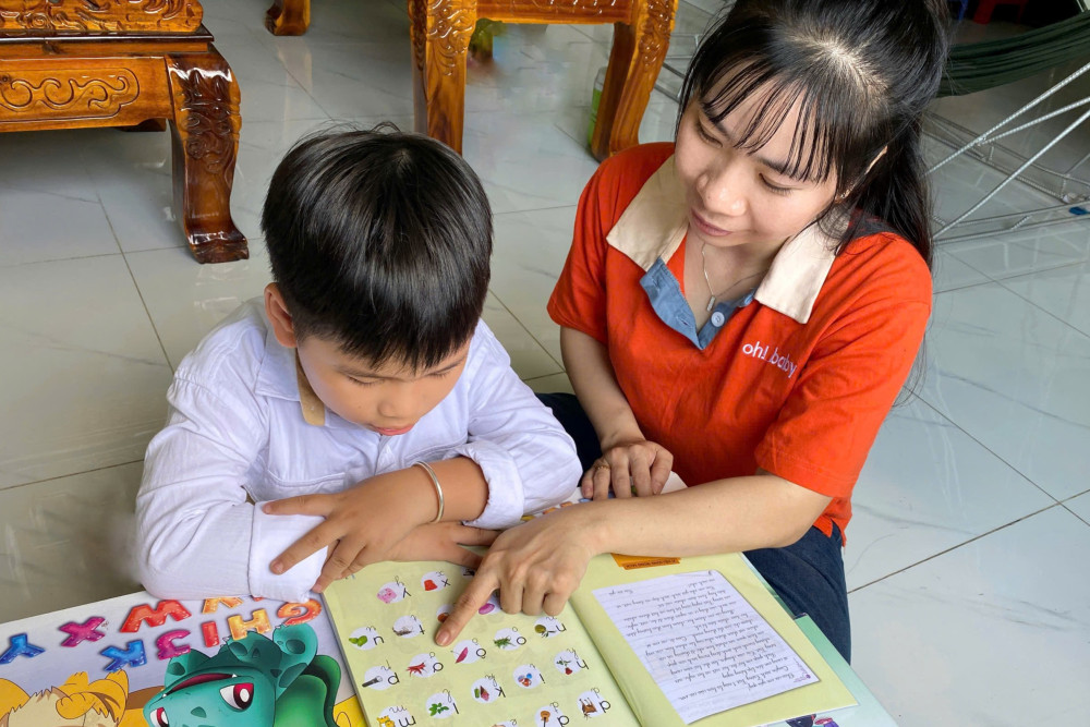 Chị Lê Thị Kim Cương (xã Thạnh Hòa, huyện Bến Lức) hướng dẫn con làm quen với những con chữ trước khi vào lớp 1