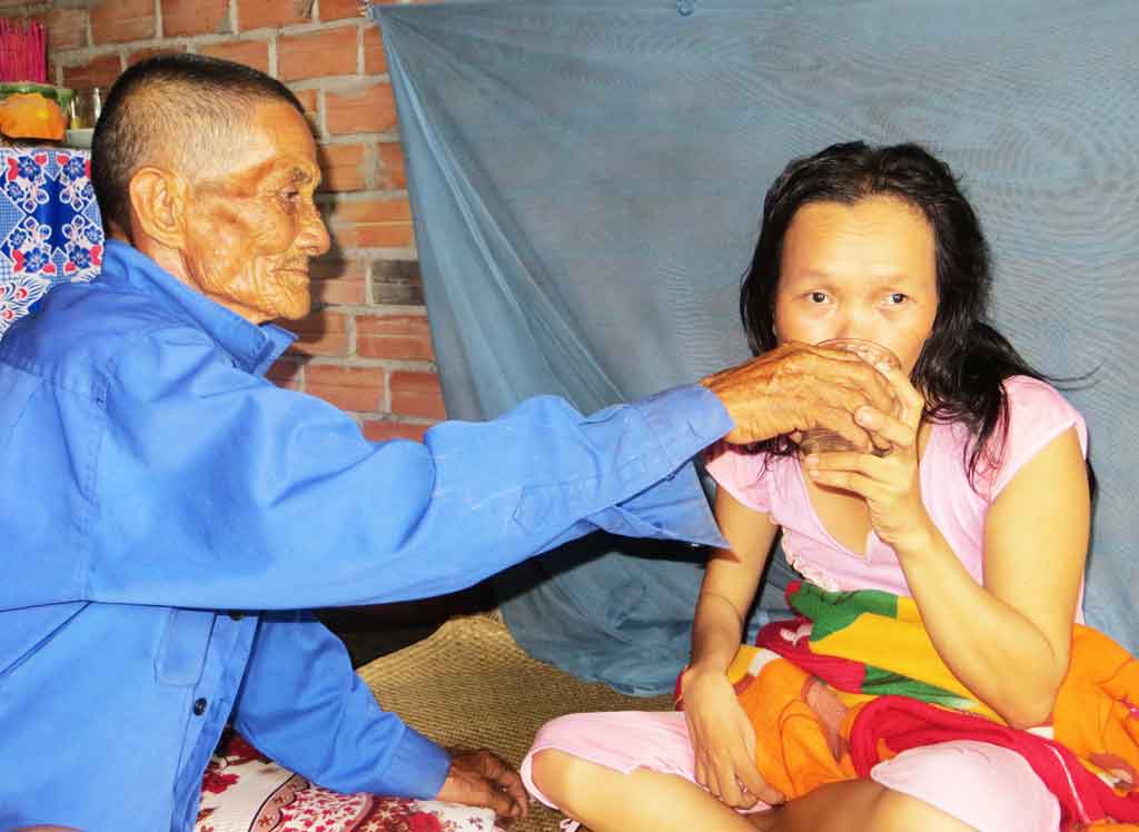 Thương mẹ chị Thơ, dù 74 tuổi nhưng mỗi ngày phải làm thuê, làm mướn để có tiền lo cho con, cho chồng. Từ sáng đến chiều, vợ ông Dũng lội bộ 4km đi hái chanh mướn. “Một giờ hái chanh, chủ vườn trả tiền công 15.000 đồng. Số tiền này chỉ đủ mua thức ăn và thuốc thang mỗi ngày cho con. Còn mỗi lần đi bệnh viện, vợ chồng tôi phải vay mượn bà con hàng xóm...”.