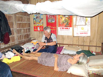 | Sau khi bị tai biến, bà Tư không còn đi lại được nữa, hằng ngày ông Giàu xoa bóp thường xuyên để bà giảm đau nhức. |