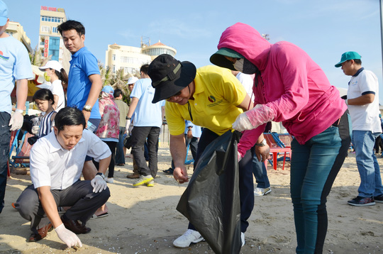 Bí thư Thành ủy Vũng Tàu (áo vàng) đến bãi biển nhặt rác. (Ảnh: nld.com.vn).