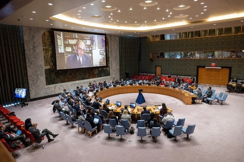 Một phiên họp khẩn cấp của Hội đồng Bảo an Liên hợp quốc thảo luận về các vụ tấn công liên tiếp của các tay súng Houthi trên Biển Đỏ ngày 3/1. (Ảnh: THX/TTXVN)