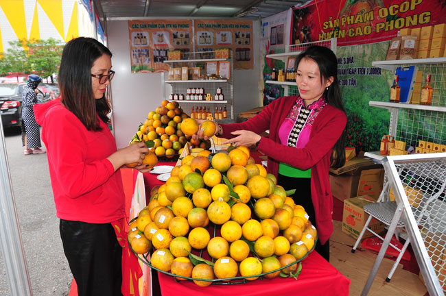 Cùng với đó, các hoạt động xây dựng, quảng bá thương hiệu nông sản hàng hóa cũng được thực hiện thường xuyên. Đến nay, tỉnh Hòa Bình đã hỗ trợ xây dựng chỉ dẫn địa lý cho sản phẩm Cam Cao Phong và xây dựng nhãn hiệu tập thể cho nhiều sản phẩm: Nhãn Sơn Thủy, huyện Kim Bôi; rau Su su Quyết Chiến, huyện Tân Lạc; sản phẩm quả Lặc Lày, huyện Lương Sơn; Cam huyện Lạc Thủy; Bưởi đỏ, huyện Tân Lạc... Nhiều mặt hàng nông sản cũng được cấp bảo hộ quyền sở hữu trí tuệ như: “ Cá sông Đà - Hòa Bình”, “ Tôm sông Đà - Hòa Bình”, “Mật ong - Hòa Bình”, “ Gà Lạc Thủy”...