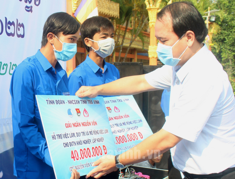 Ông Lê Hoàng Phi, Phó Giám đốc Ngân hàng Chính sách xã hội chi nhánh Trà Vinh trao bảng tượng trưng hỗ trợ vốn lập thân, lập nghiệp cho ĐVTN huyện Cầu Ngang năm 2022.