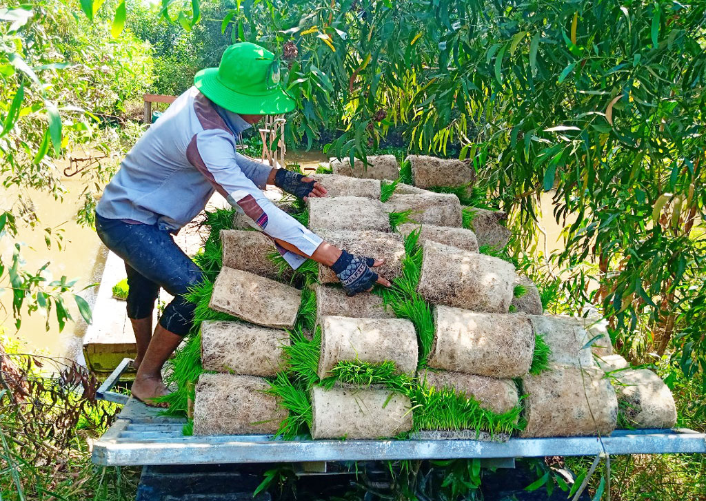 Bà Trương Thị Ánh Hồng, ngụ xã Kiến Bình, thông tin: “Từ lúc gieo đến lúc cấy là 19 ngày, vì vậy ai muốn mua thì phải đặt trước 20 ngày. Hiện nay, nông dân trồng lúa giống chủ yếu là mua mạ về cấy, năng suất và chất lượng bảo đảm hơn”.