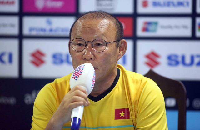 HLV Park Hang Seo phát biểu tại buổi họp báo - Ảnh: N.K