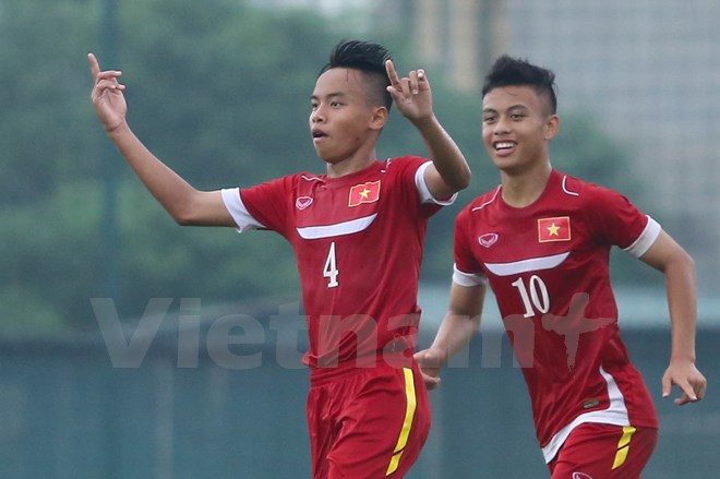 Thắng lợi trước U16 Myanmar giúp U16 Việt Nam tạm đứng nhì bảng J. (Ảnh: Minh Chiến/Vietnam+)