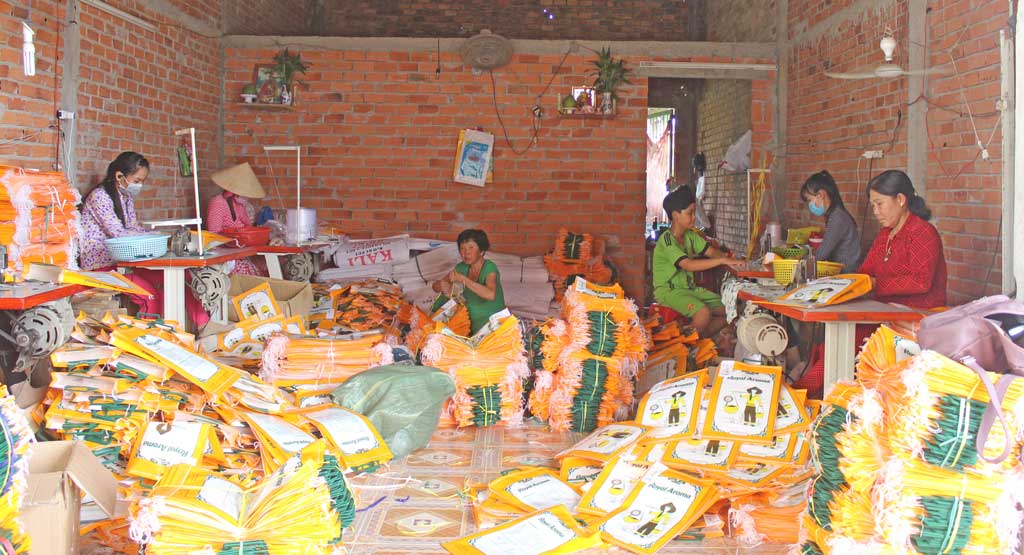 Nhằm giải quyết nhu cầu đó, năm 2009, Hội Liên hiệp Phụ nữ (LHPN) xã mở lớp dạy nghề may công nghiệp. Kết thúc lớp học, hội mạnh dạn thành lập tổ may bao gia công với hơn 50 thành viên, đồng thời liên hệ các công ty, doanh nghiệp nhận hàng về cho các thành viên gia công với tiền công trên 200.000 đồng/người/ngày.