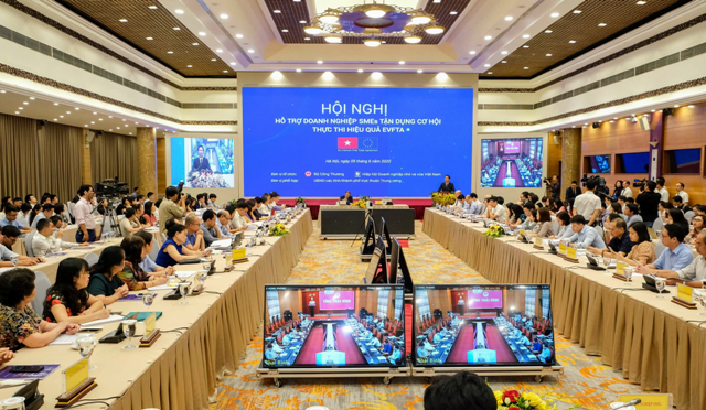 | Hội nghị “Hỗ trợ doanh nghiệp SMEs tận dụng cơ hội, thực thi hiệu quả EVFTA” theo hình thức trực tiếp tại Hà Nội và trực tuyến tại các điểm cầu. |