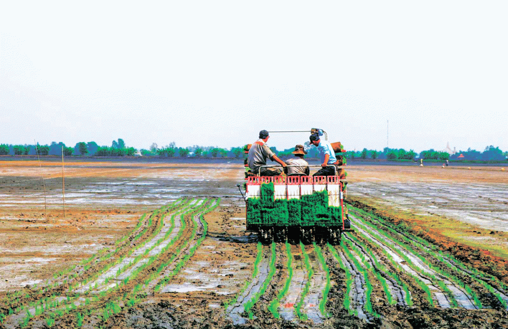 Gieo trồng lúa bằng máy cấy giúp nông dân giảm mạnh lượng giống sử dụng xuống chỉ còn ở mức 40-60 kg/ha. Trong ảnh: Cấy lúa bằng máy ở huyện Vĩnh Thạnh.