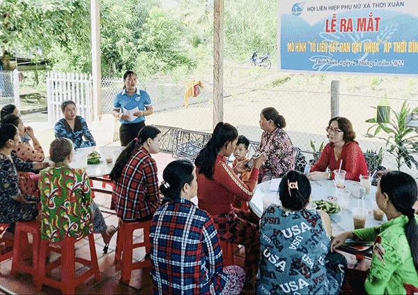 Hội LHPN xã Thới Xuân ra mắt mô hình “Tổ liên kết đan dây nhựa”, hỗ trợ nhiều hội viên, phụ nữ, trong đó có phụ nữ DTTS có việc làm ổn định cuộc sống. Ảnh: Hội LHPN xã Thới Xuân