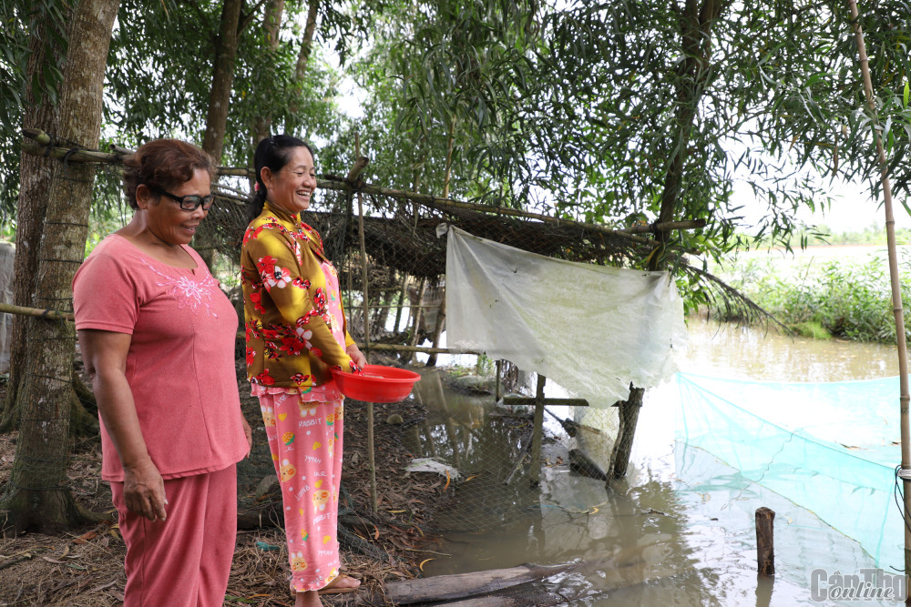 Bà Lý Thị Kim Mai, Tổ trưởng Tổ tiết kiệm và vay vốn Ngân hàng CSXH ấp Đông Thạnh (bìa trái) thăm hỏi tình hình sản xuất của các hộ gia đình được vay vốn.