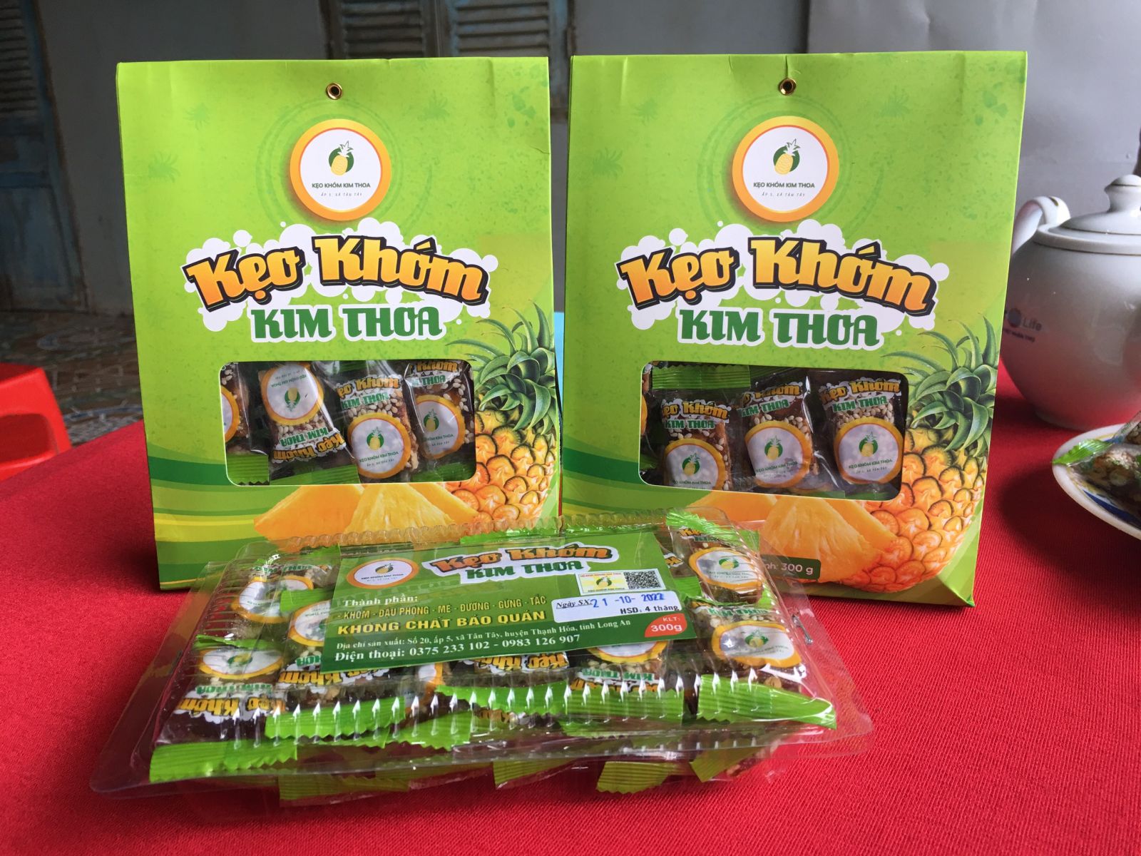 Với nguồn nguyên liệu khóm tại chỗ dồi dào này, hộ kinh doanh Kim Thoa có kinh nghiệm làm kẹo từ trái khóm nhiều năm. Đặc biệt, hộ này còn quyết tâm xây dựng sản phẩm kẹo khóm là sản phẩm OCOP của huyện, tỉnh. Vì vậy, hộ kinh doanh Kim Thoa mạnh dạn đầu tư dây chuyền sản xuất kẹo khóm nhằm từng bước khép kín sản xuất, nâng cao năng suất, chất lượng, bảo đảm an toàn vệ sinh thực phẩm. Dây chuyền sản xuất kẹo khóm được đầu tư gồm nồi sên, máy cán ép, máy cắt, máy đóng gói thành phẩm công suất từ 50 đến 150 gói kẹo/phút.