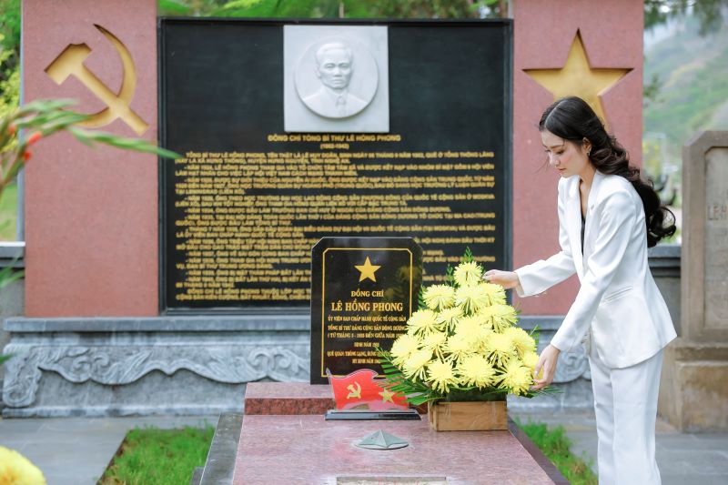 | Hoa hậu Thanh Hà thắp hương viếng mộ Tổng Bí thư Lê Hồng Phong |