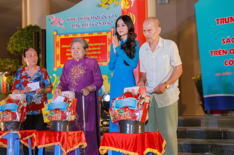| Hoa hậu Thanh Hà tặng quà cho 3 bác cựu tù chính trị Côn Đảo |