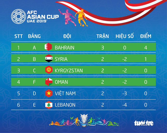 Theo đó, UAE là đội nhất bảng, Thái Lan từ ứng cử viên cho chiếc vé vớt lại vươn lên hạng nhì, nhường vị trí thứ 3 cho Bahrain.