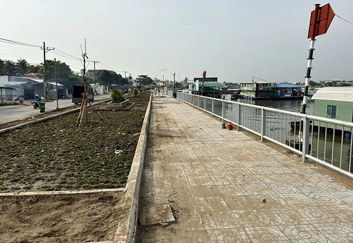 Một đoạn kè bờ sông Cần Thơ - Ứng phó biến đổi khí hậu phía bờ Cái Răng đã cơ bản hoàn thành.