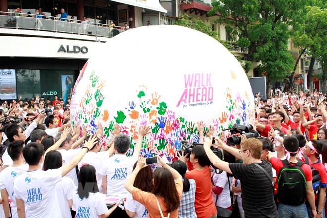Giới trẻ in bàn tay lên Quả cầu năng lượng, tiếp thêm nguồn sức mạnh cho sở hữu trí tuệ, đổi mới sáng tạo. (Ảnh: Hoàng Hà/TTXVN)
