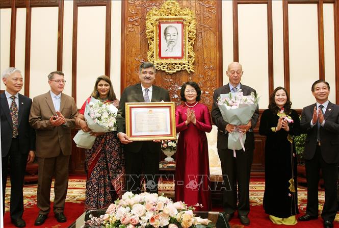 Phó Chủ tịch nước Đặng Thị Ngọc Thịnh trao tặng Huân chương Hữu nghị của Nhà nước cho Ban lãnh đạo Làng trẻ em SOS quốc tế (Ảnh: Nguyễn Dân/TTXVN)