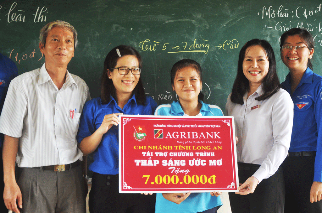 Đại diện Đoàn Cơ sở Ngân hàng Nông nghiệp và Phát triển Nông thôn - chi nhánh Long An trao học bổng cho em Ngô Ngọc Linh