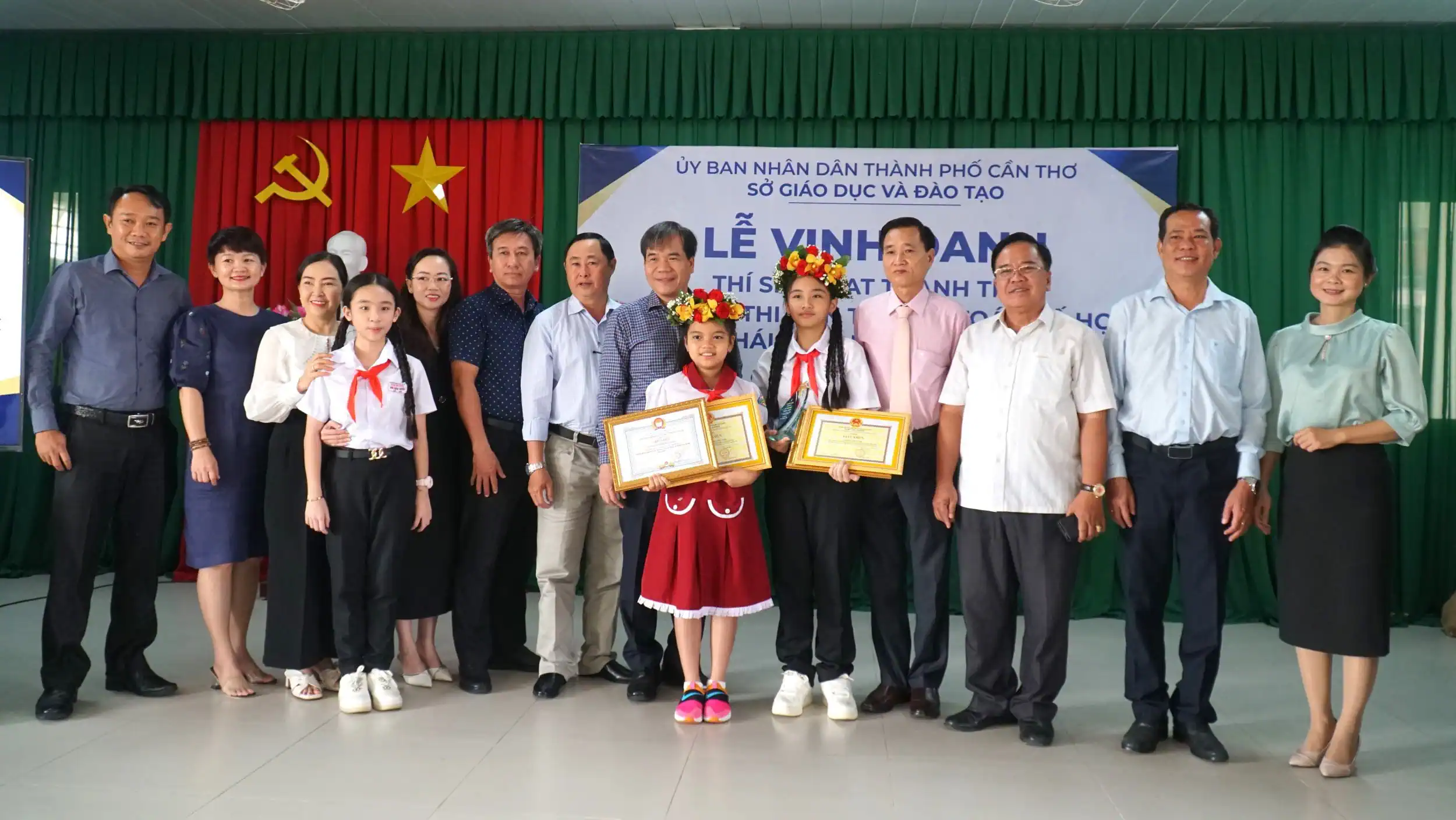 Đại biểu và hai em Bùi Thảo Tiên, Nguyễn Châu Bảo Ngọc tại lễ vinh danh thí sinh đạt thành tích trong cuộc thi.