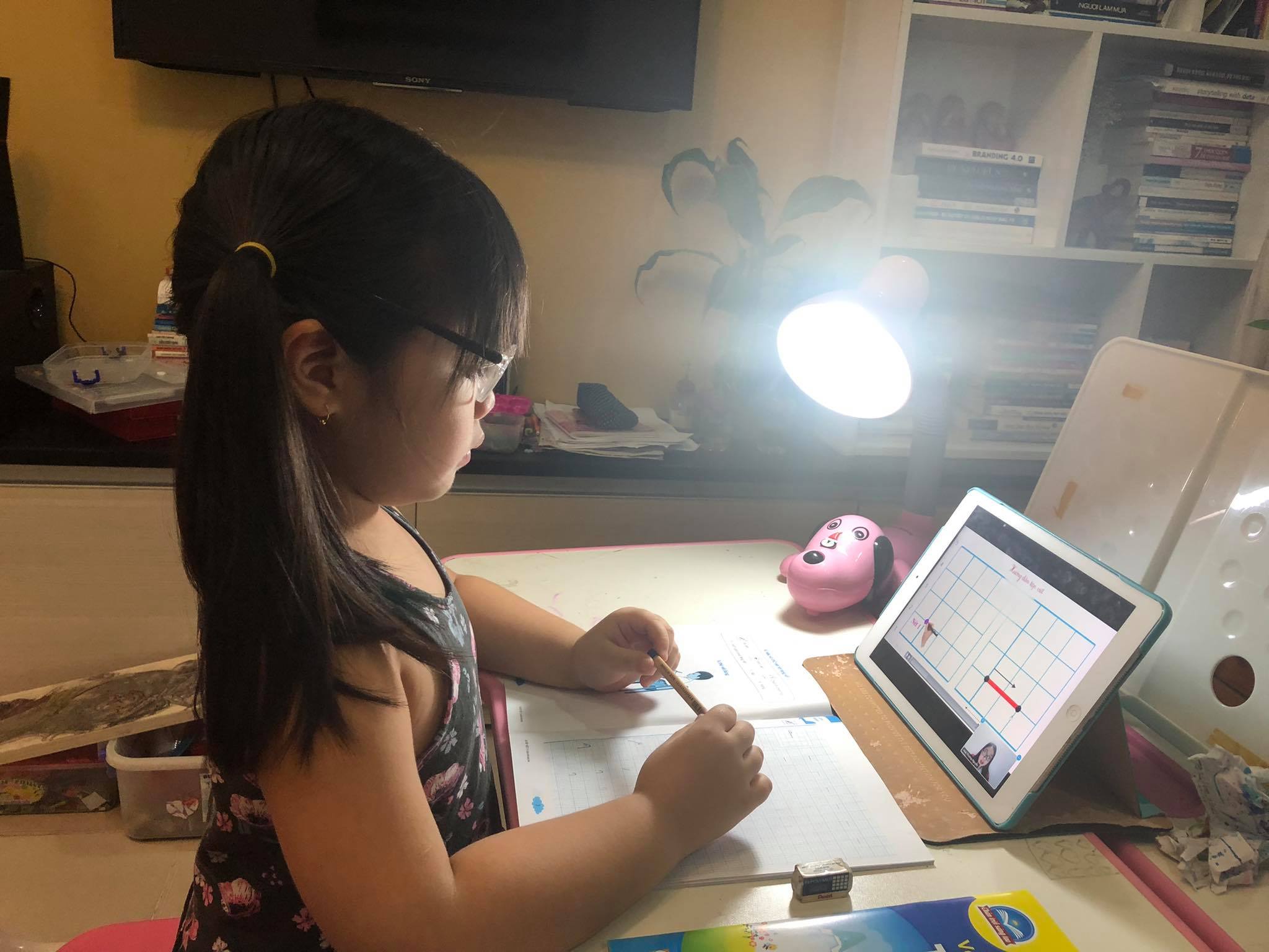 | Con chị Trần Thanh Xuân học trực tuyến vào buổi tối. Ảnh: VL |