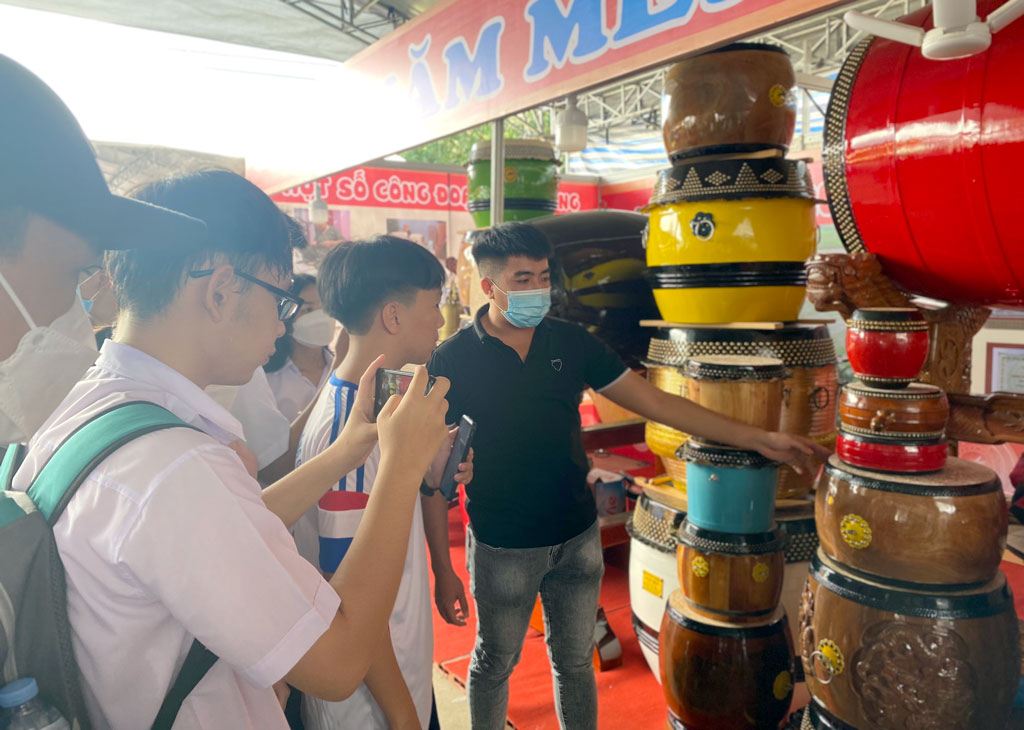 Đến Lễ hội Ẩm thực đường phố - Làng nghề truyền thống gắn với Hội chợ triển lãm OCOP tỉnh Long An, HS khối 10 Trường THPT Chuyên Long An lắng nghe và ghi chép lại những thông tin của các nghệ nhân, chủ sản phẩm đặc sản chia sẻ. Trong đó, tại gian hàng làng nghề làm trống Bình An, các em được giới thiệu về lịch sử của làng nghề, các công đoạn làm trống,... Thông qua các hoạt động này, HS được tiếp cận thực tế về công việc sản xuất, kinh doanh, dịch vụ của địa phương bên cạnh những giờ học lý thuyết trên lớp.