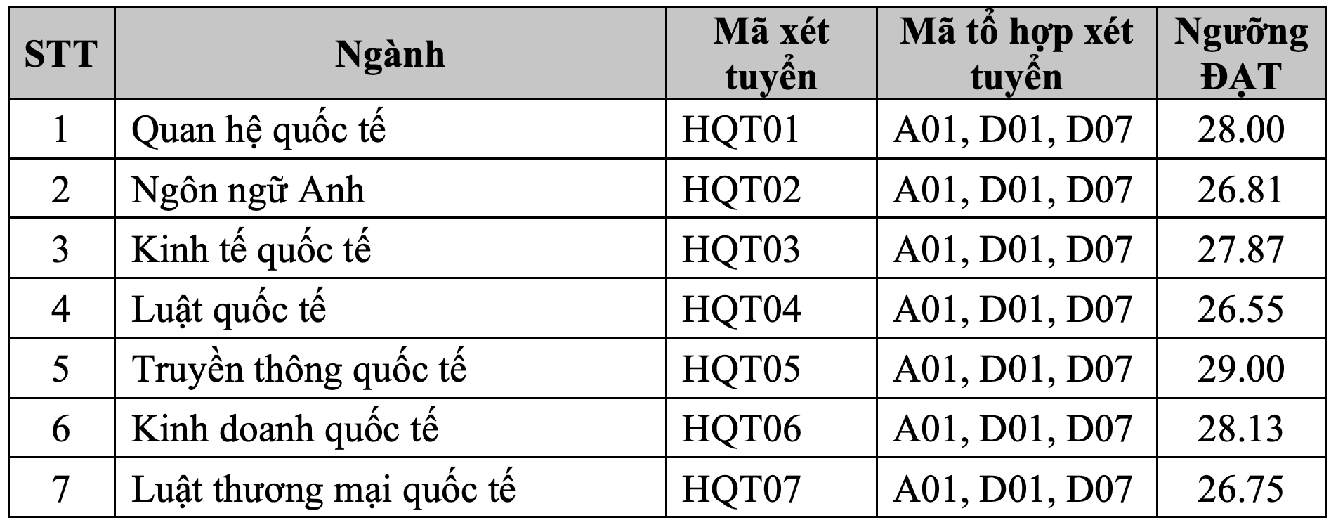 Thí sinh được xác định trúng tuyển chính thức khi tốt nghiệp THPT, đạt ngưỡng đảm bảo chất lượng đầu vào của Học viện Ngoại giao và được Bộ Giáo dục và Đào tạo (GD&ĐT) xác định trúng tuyển trên hệ thống xét tuyển chung của Bộ.