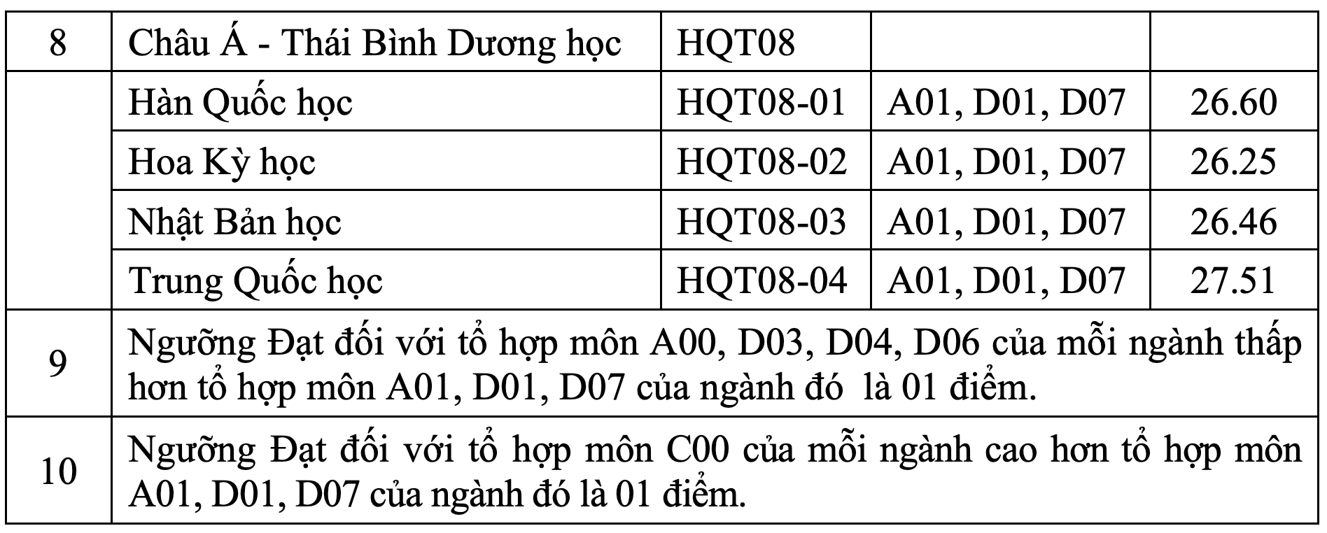 Với các ngành Quan hệ quốc tế, Kinh tế quốc tế, Luật quốc tế, Kinh doanh quốc tế, Truyền thông quốc tế, Châu Á - Thái Bình Dương học và Luật thương mại quốc tế: Điểm xét tuyển = (Tổng của điểm trung bình cộng kết quả học tập 3 môn thuộc tổ hợp xét tuyển + điểm ưu tiên, điểm khuyến khích) x 0,88.